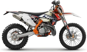 The 2019 KTM 300 EXC TPI Six Days, in the Enduro category, is equipped with a Single-cylinder - 2-stroke engine, producing 55 HP (40.5 kW), with a dry weight of 104 kg.